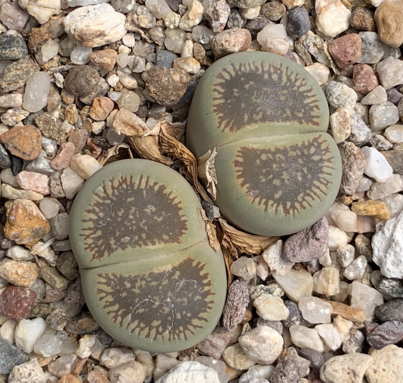 Popularly called “Living Stones”, Lithops are some of the world’s most fascinating plants! Since their discovery by John Burchell in 1811 when “on picking up from the stony ground what was supposed a curiously shaped pebble, it proved to be a plant”, Lithops have been avidly sought by the collector of succulent plants. Resembling the pebbles and stones among which they grow in their African habitat, they have become favorites of the collector of strange and unusual plants. Their subtle colors of gray, brown, rust, green and pink, combined with their fantastically intricate markings, make them most desirable additions to any plant collection.