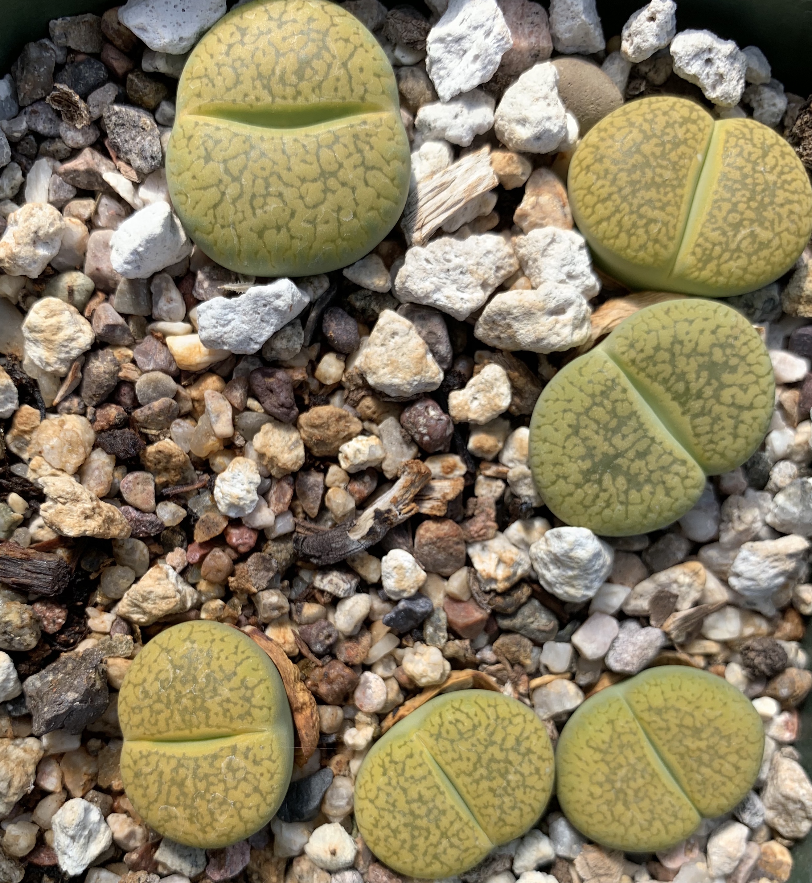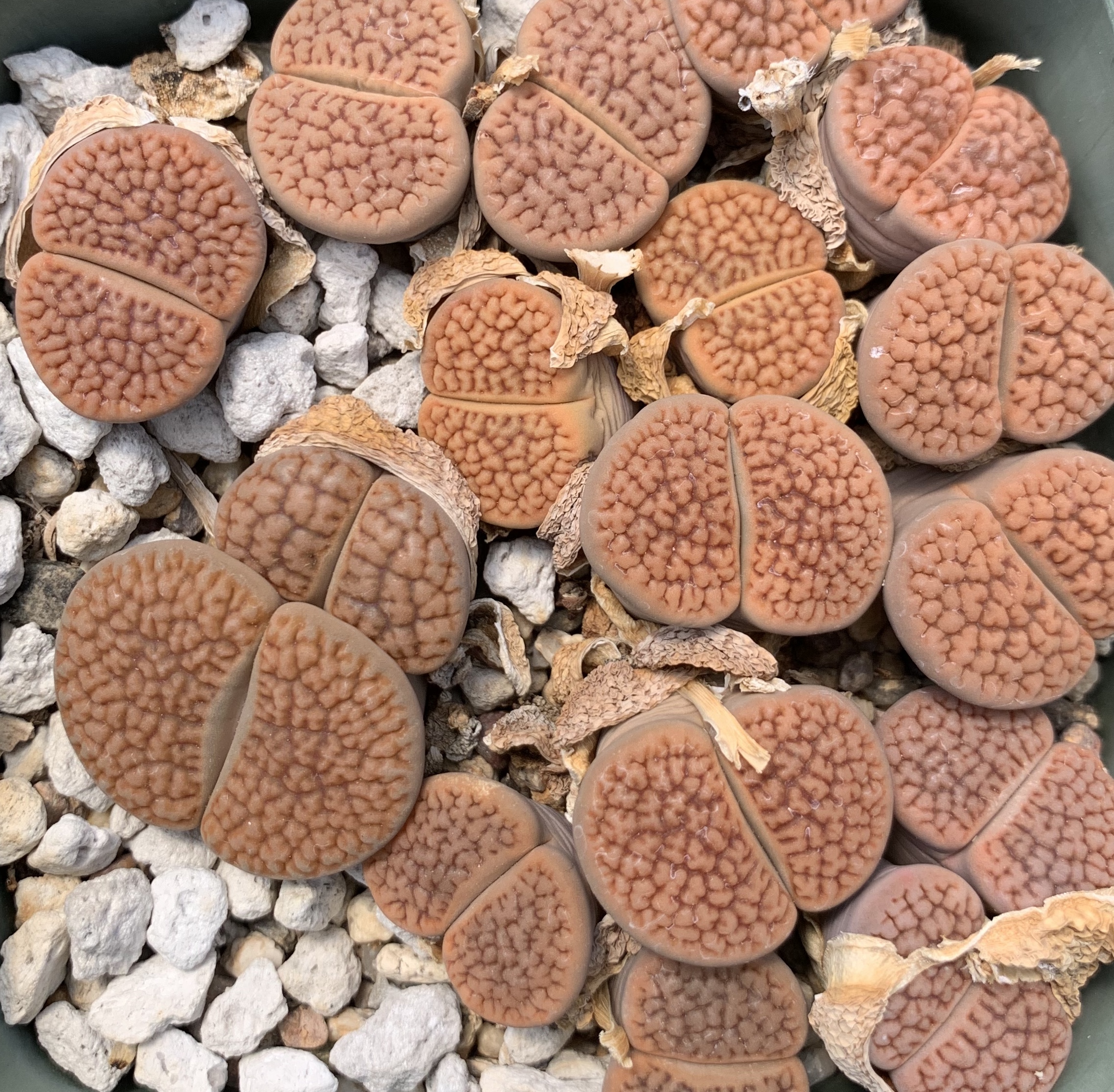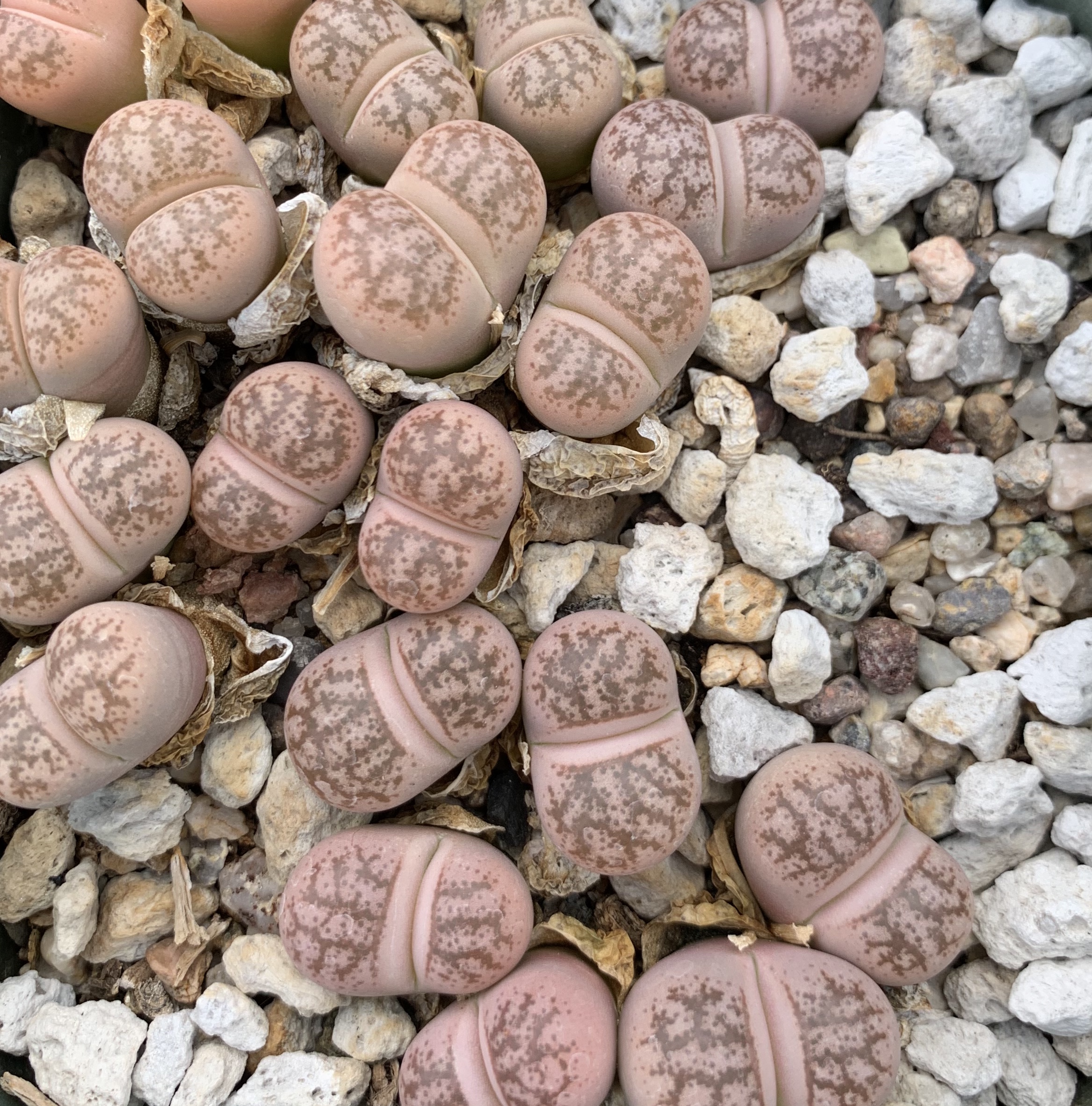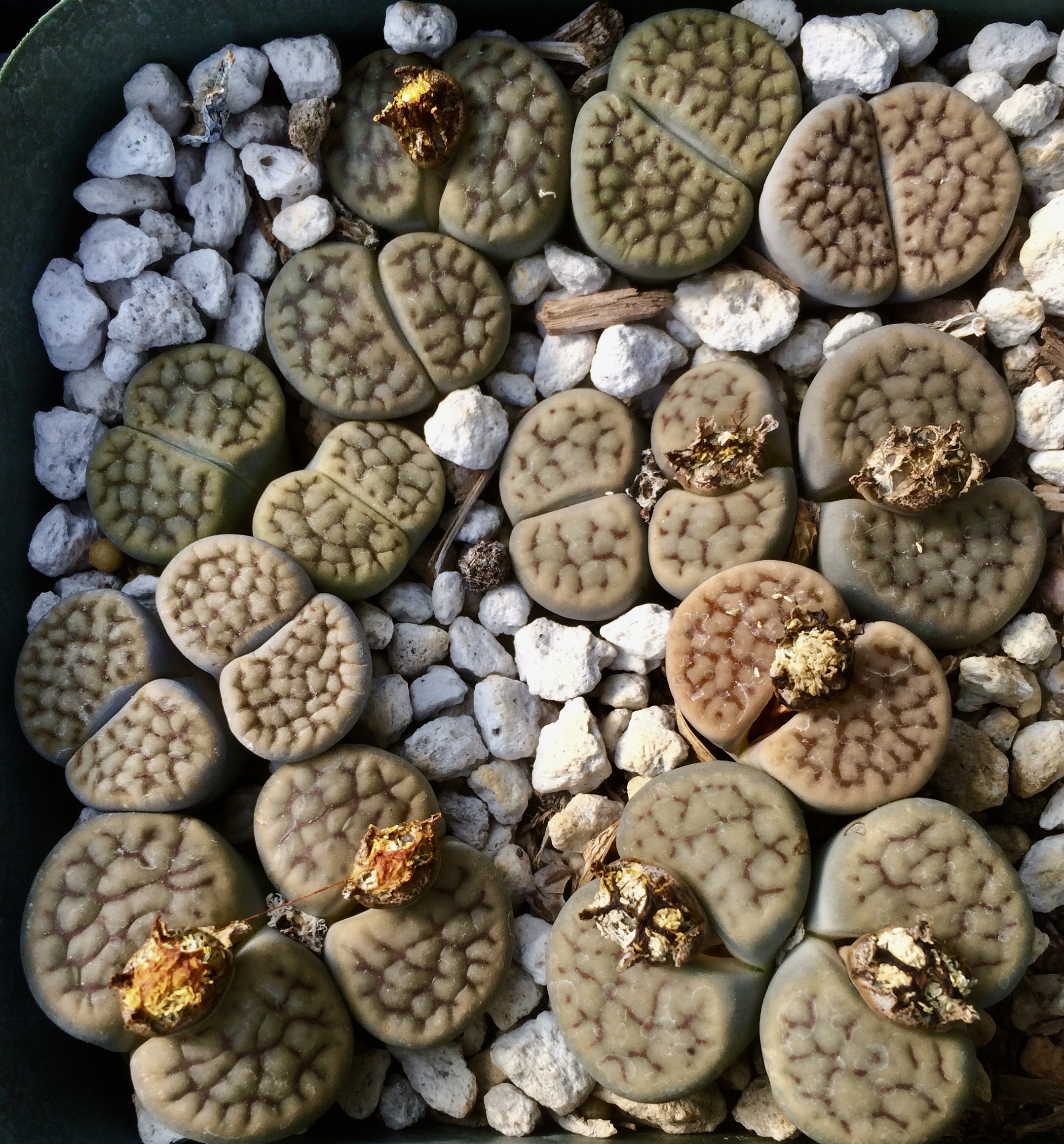 We pot our lithops in our standard succulent medium. It’s approximately 50% pumice (perlite works just as well for the plant, though it tends to float.) Two crucial factors in lithops cultivation are fast-draining soil and good air movement.