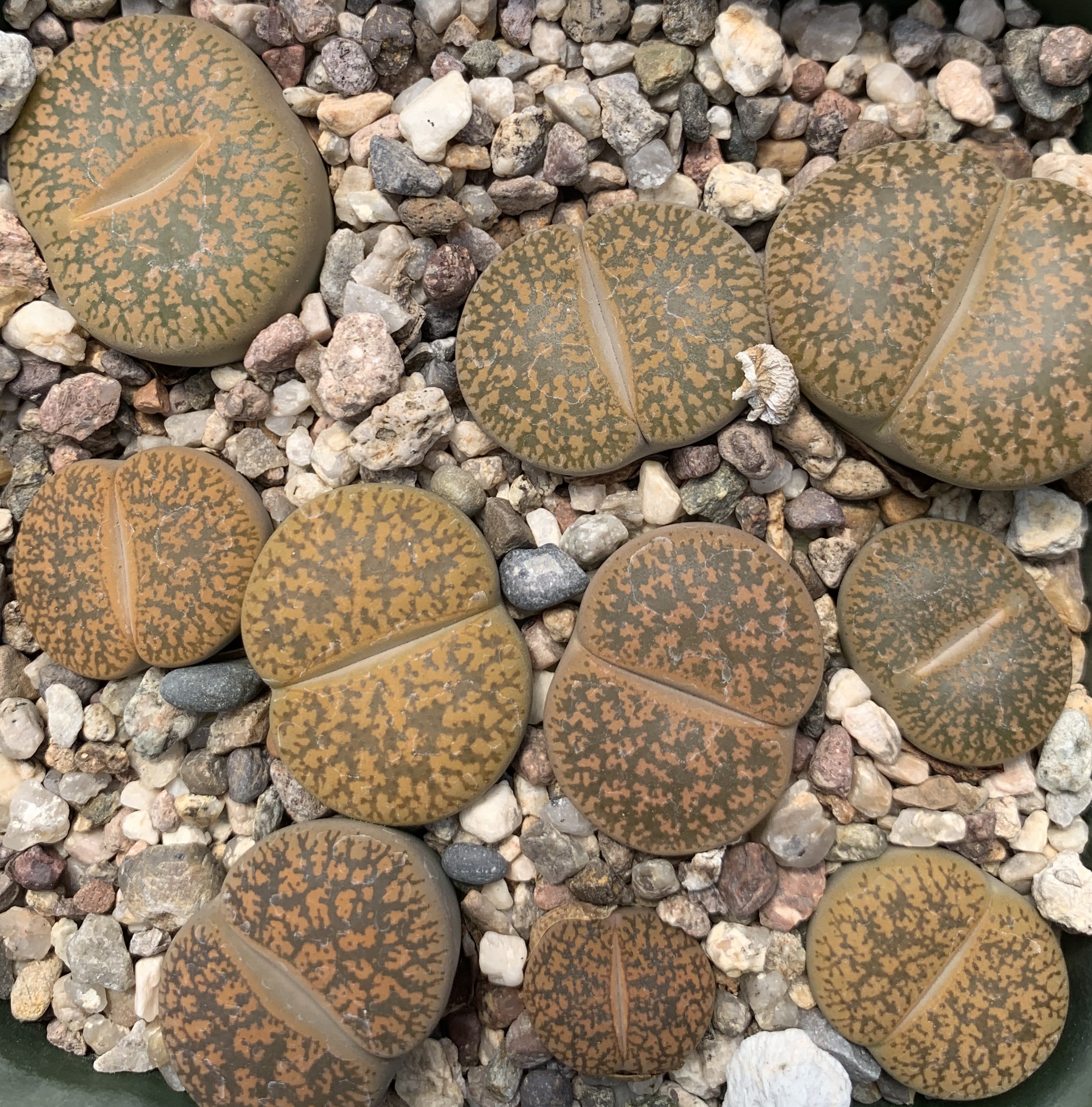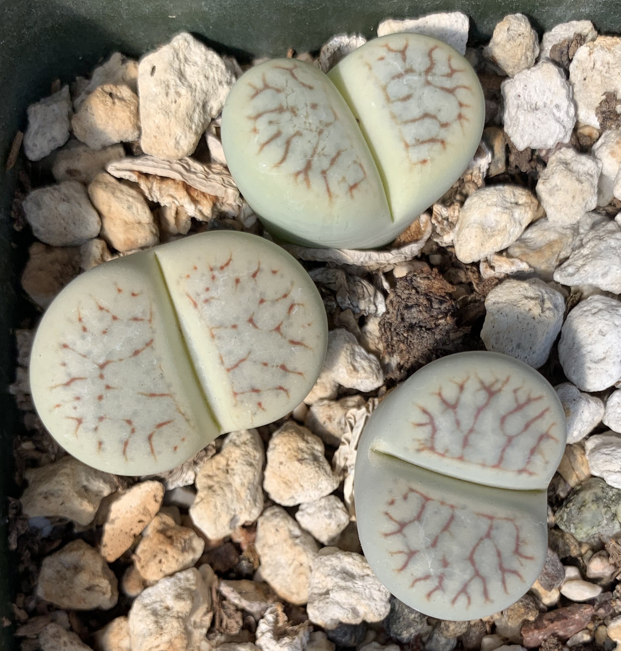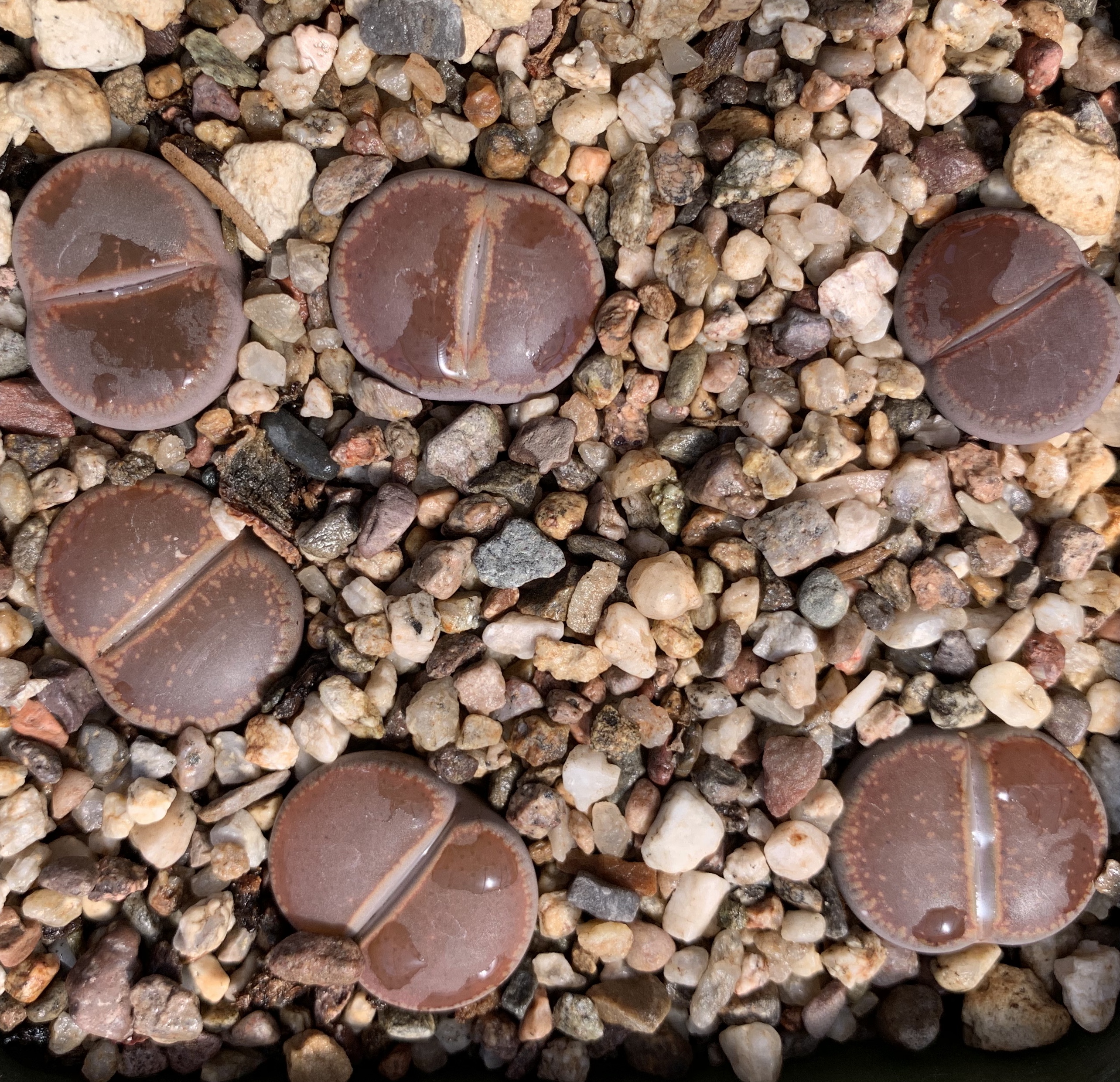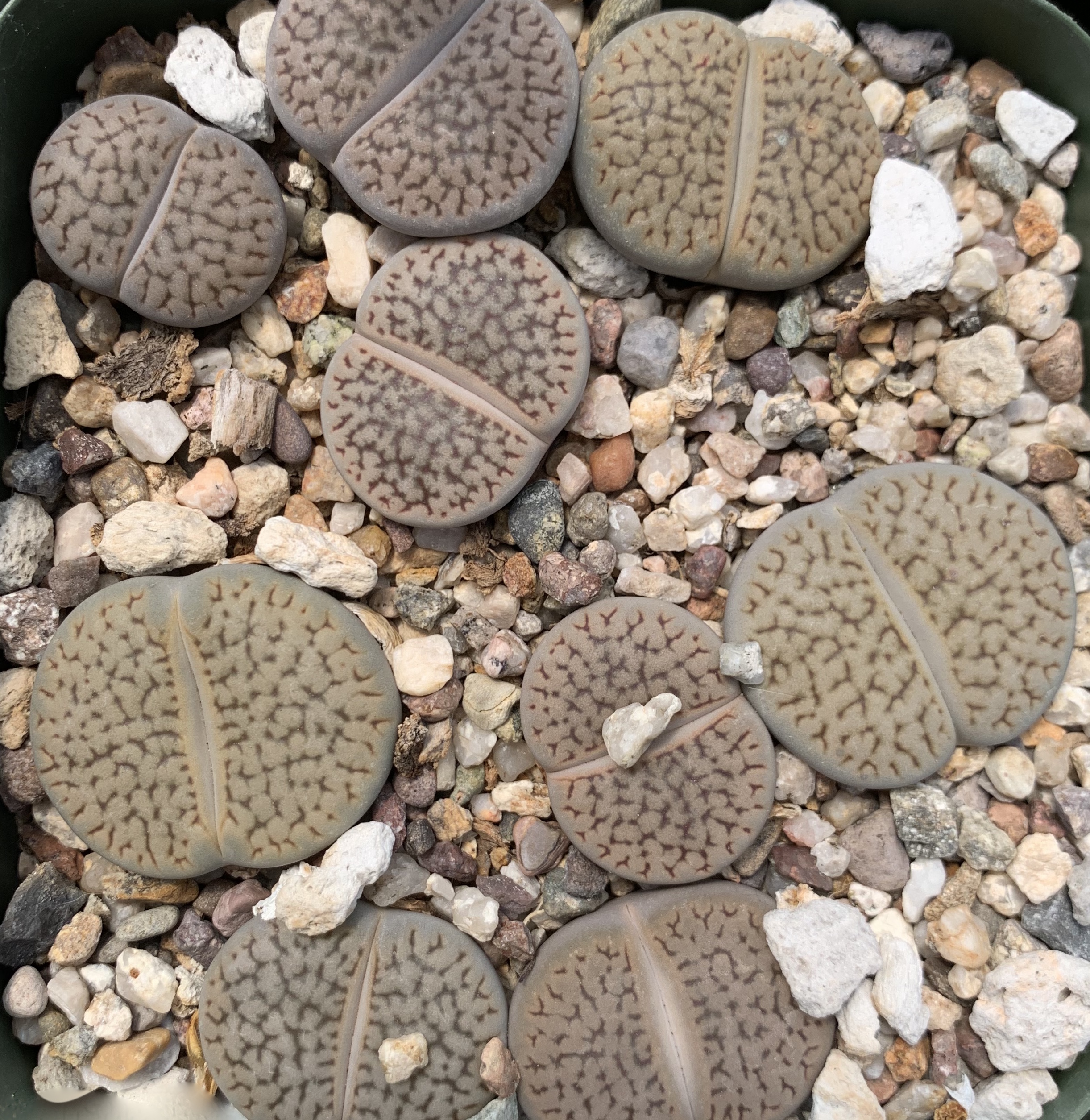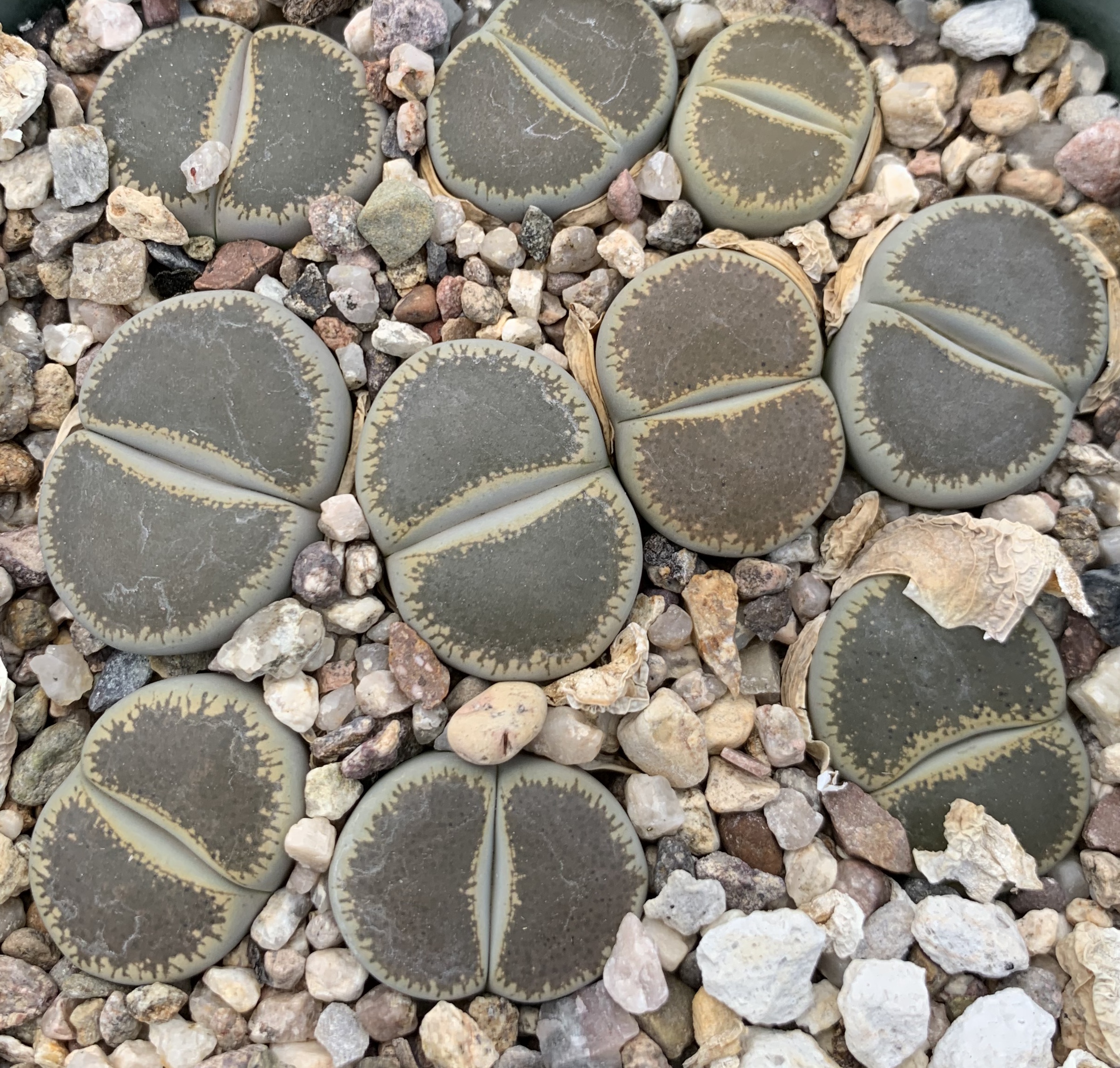 We pot our lithops in our standard succulent medium. It’s approximately 50% pumice (perlite works just as well for the plant, though it tends to float.) Two crucial factors in lithops cultivation are fast-draining soil and good air movement.