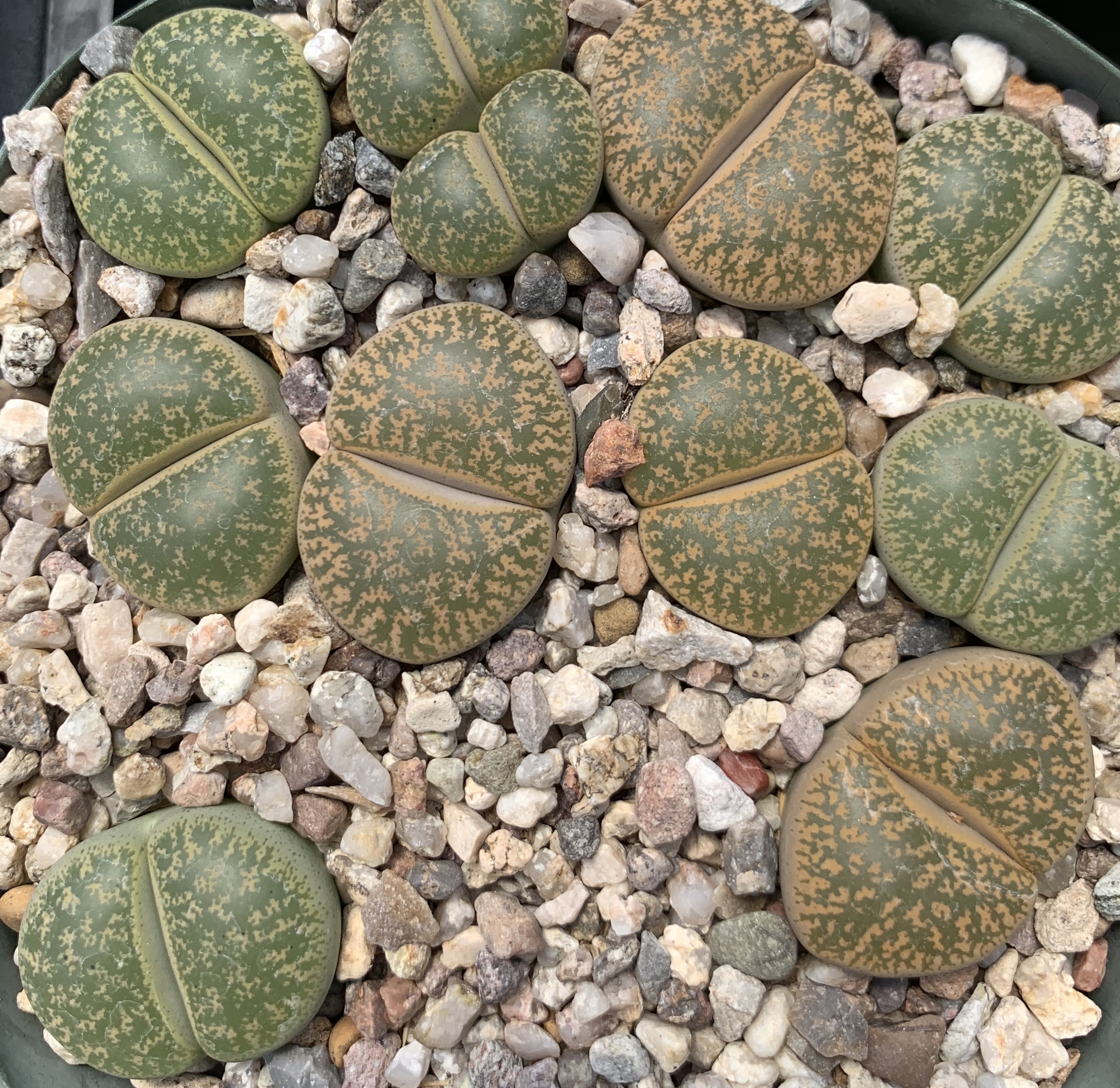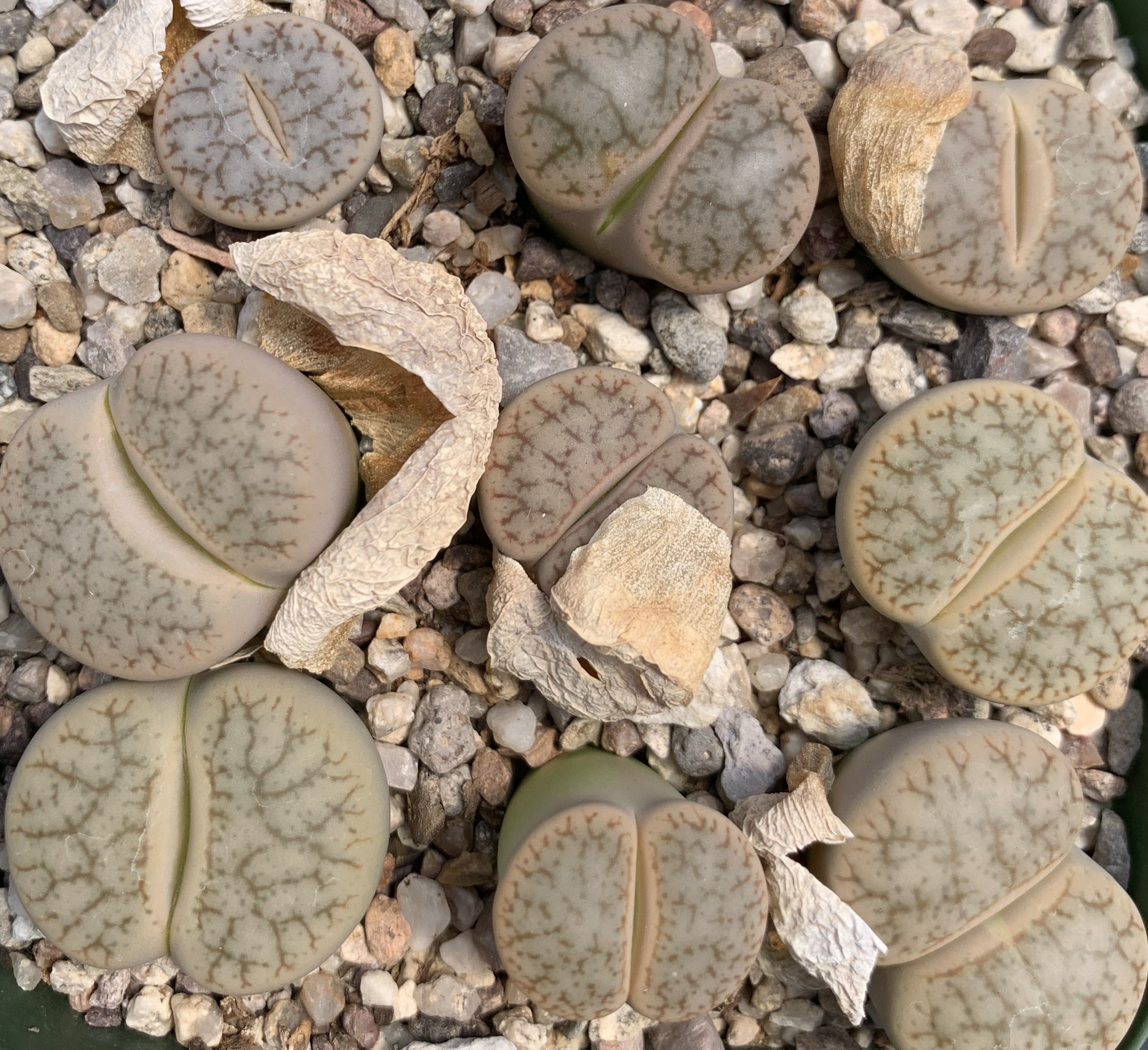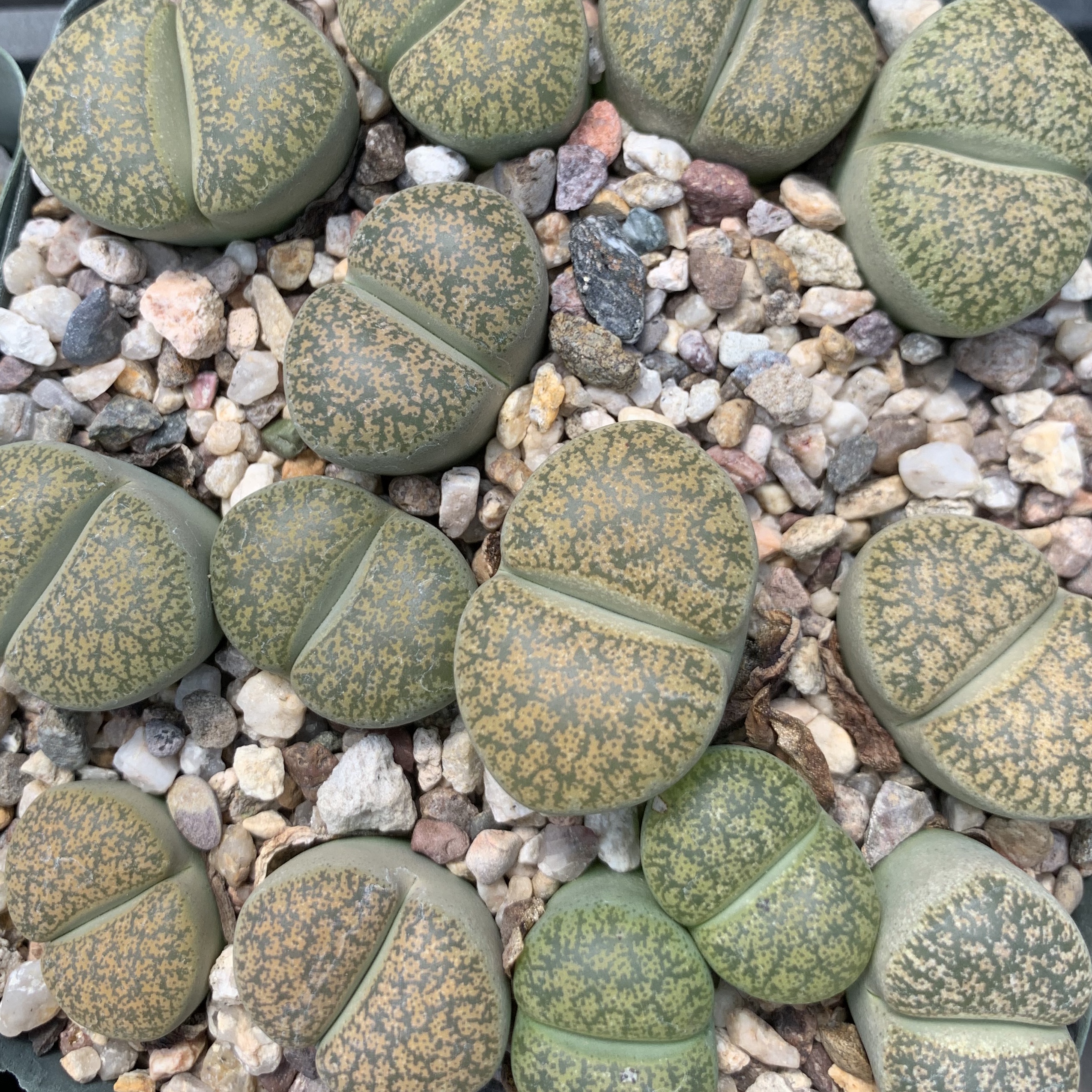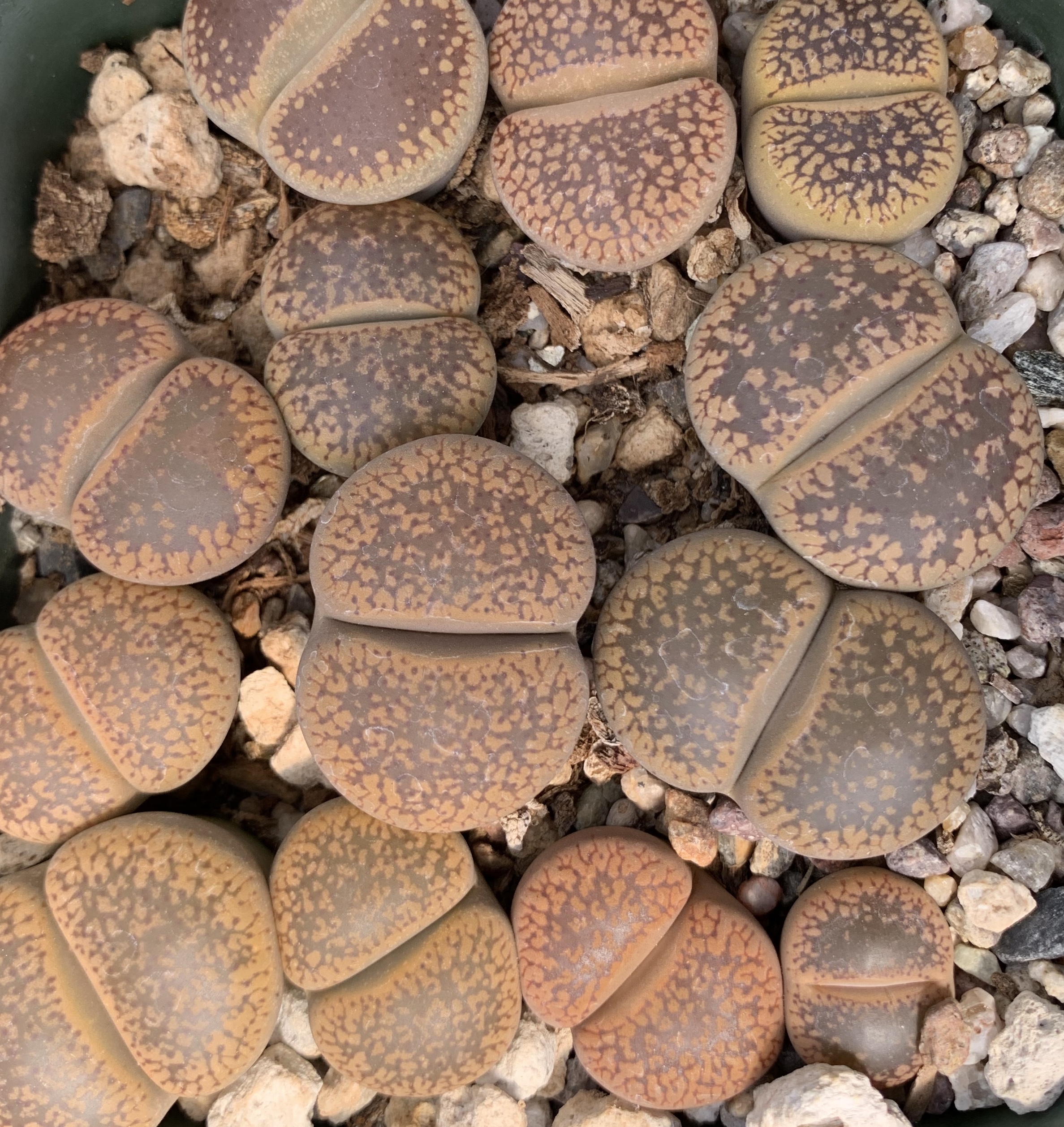 We pot our lithops in our standard succulent medium. It’s approximately 50% pumice (perlite works just as well for the plant, though it tends to float.) Two crucial factors in lithops cultivation are fast-draining soil and good air movement.