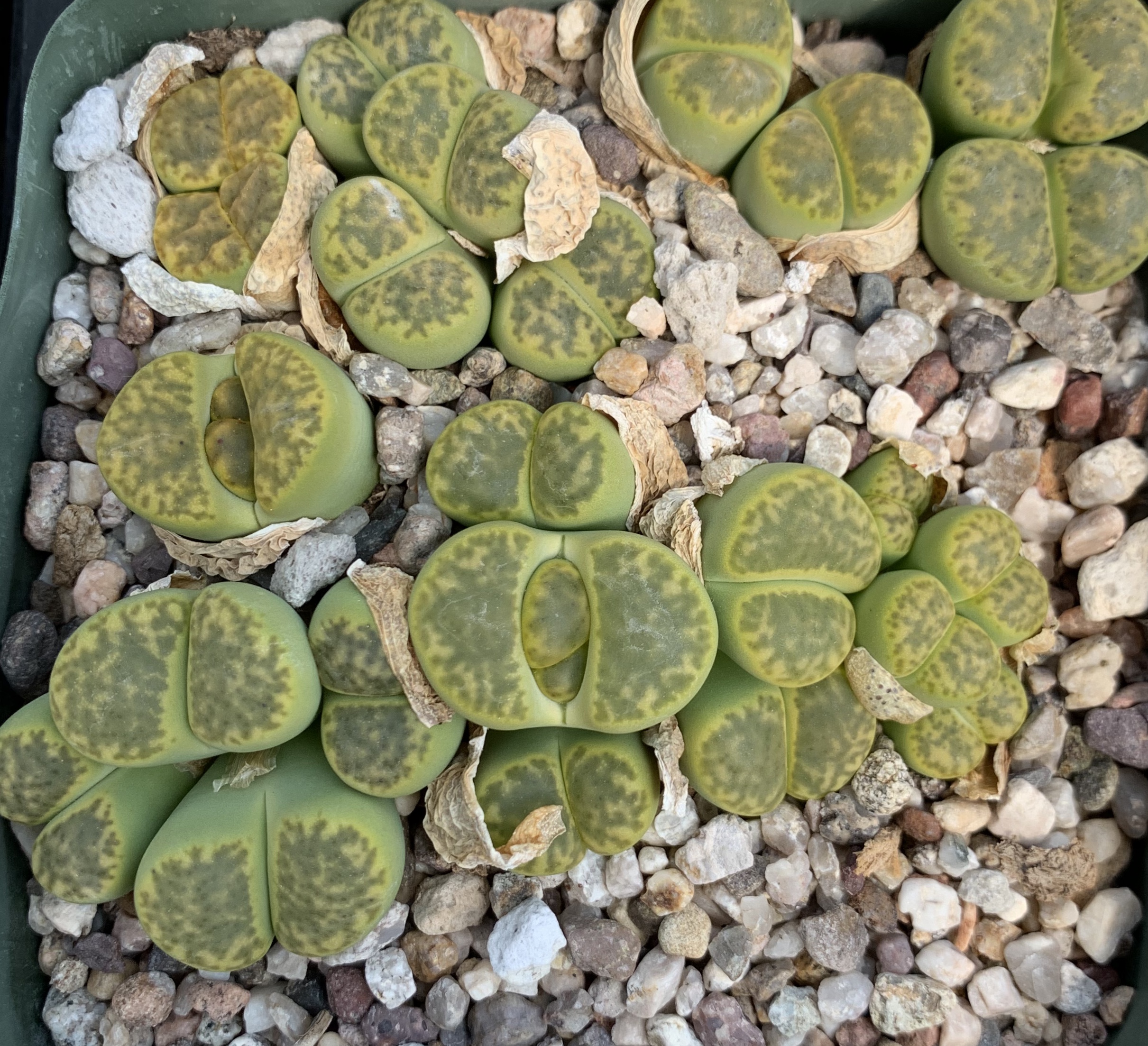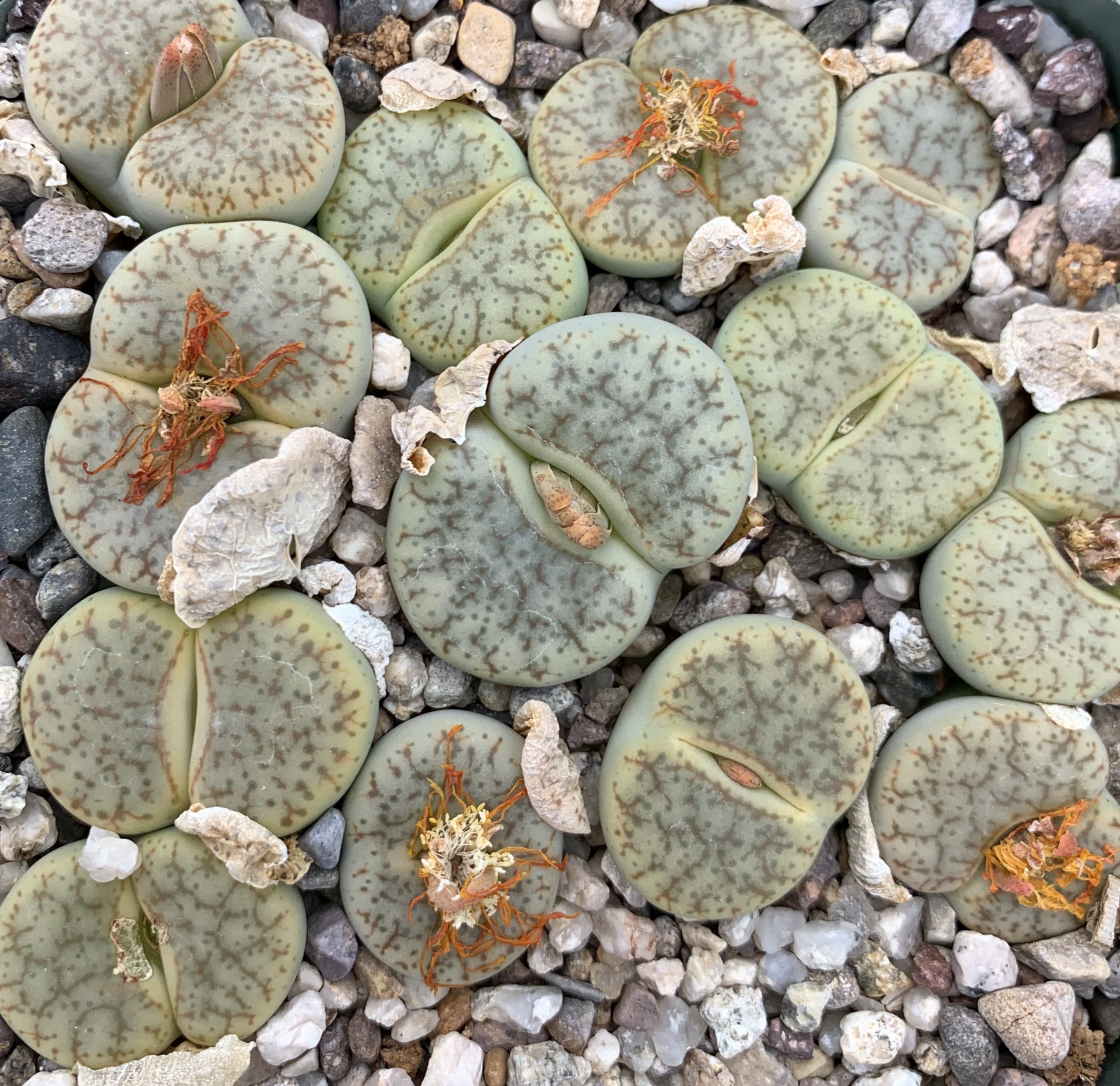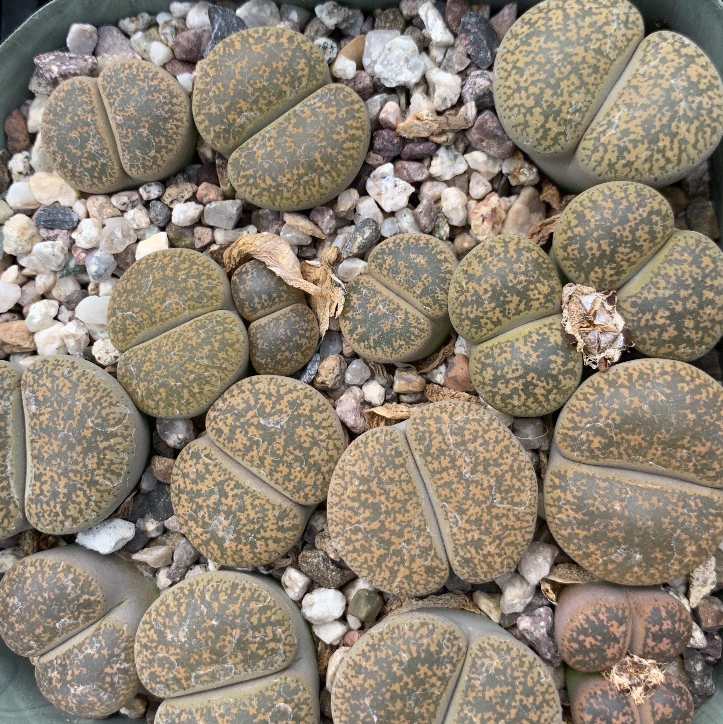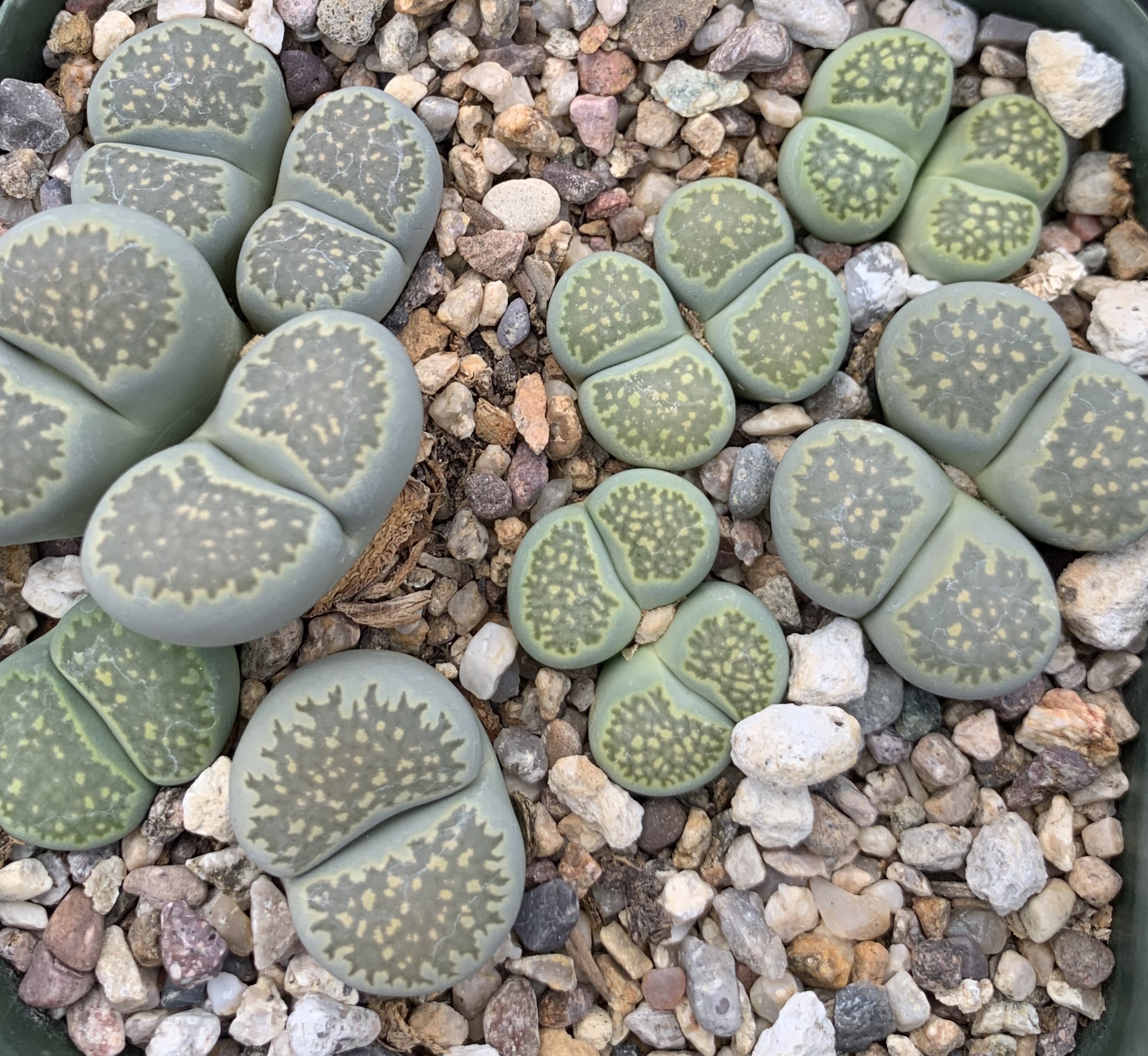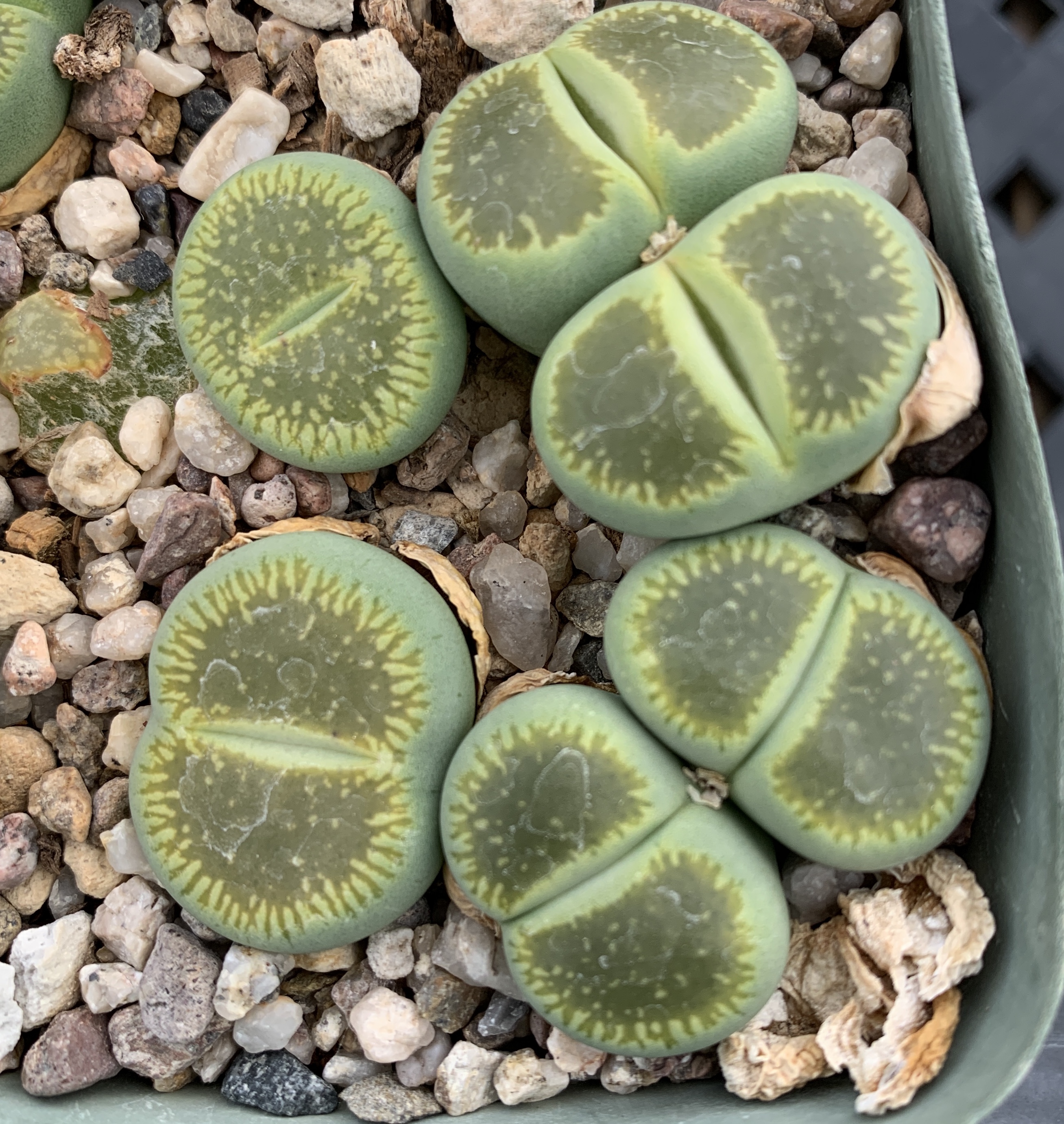 We pot our lithops in our standard succulent medium. It’s approximately 50% pumice (perlite works just as well for the plant, though it tends to float.) Two crucial factors in lithops cultivation are fast-draining soil and good air movement.